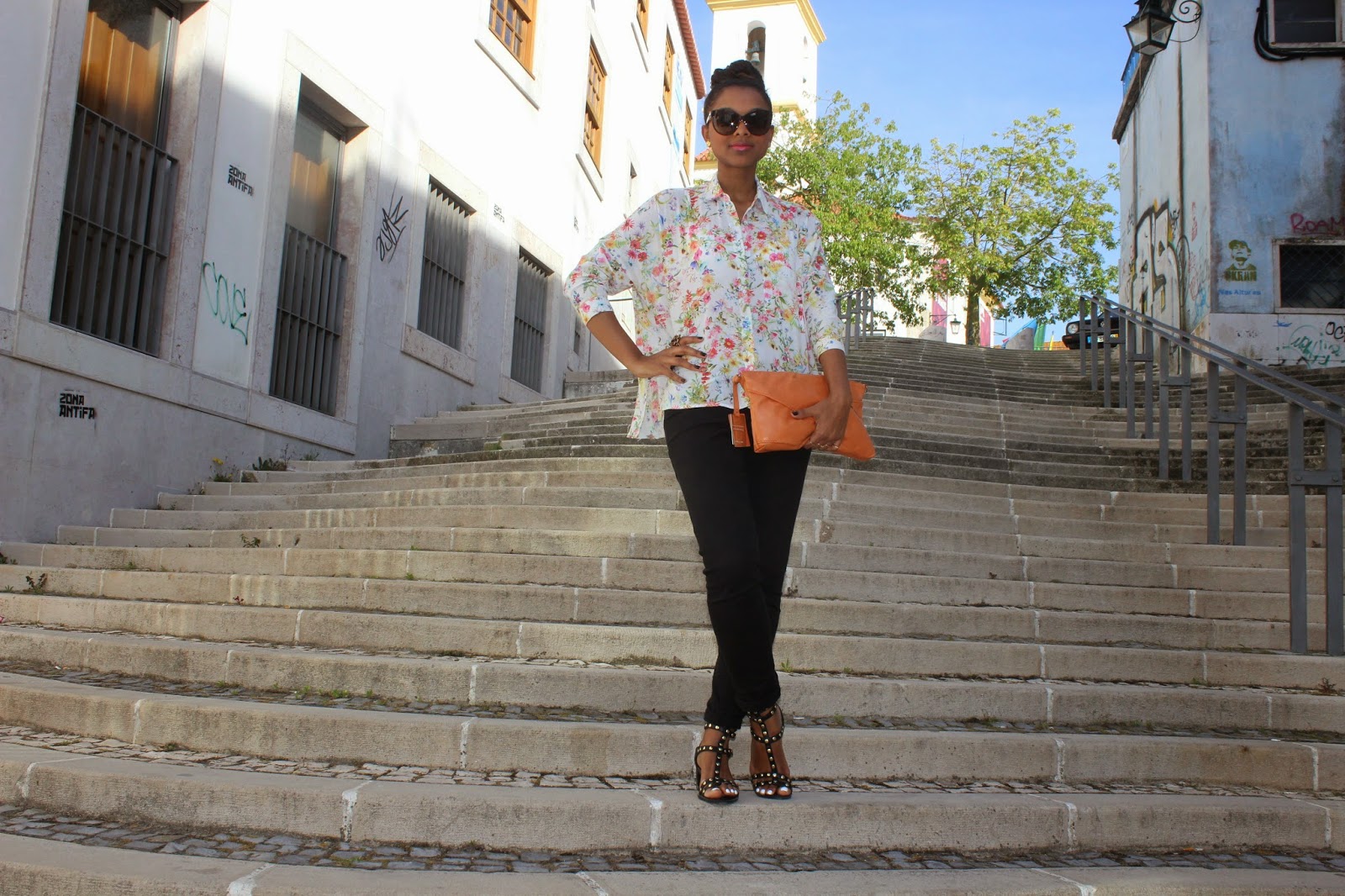Happy Mother's Day!! What was the outfit that I choose to go for a walk with my mother? Floral shirt, black skinny jeans and sandals. Perfect choice e very comfortable. For the hairstyle I did a knot bun, perfect for this weather, it's been really hot, and also because it is really easy to do! It was a day very well spent. I hope you like the pictures and I appreciate all your comments. Wish you all a great week!!