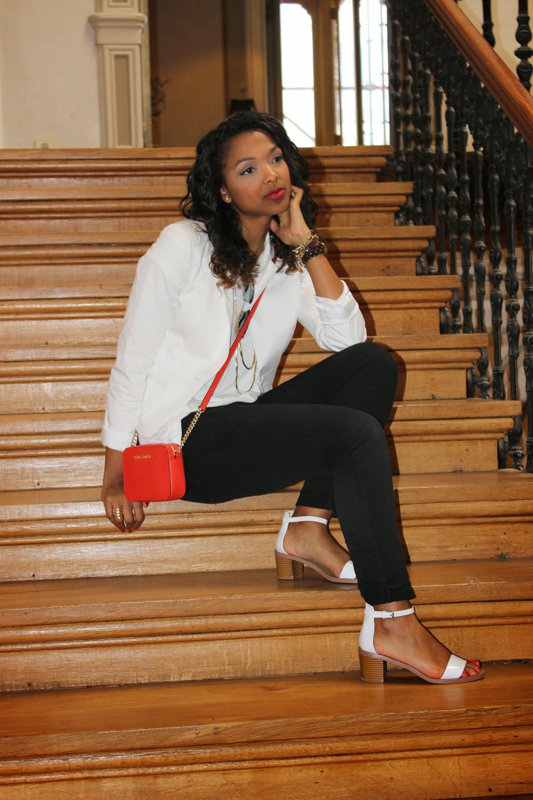 Hello! Today's post has one of my favorite looks, because it's a really simple combination, but with the right accessories, hairstyles and make-up, it becomes very elegant and fashion. These is what I wore last friday, white t-shirt and blazer, black skinny jeans and white sandals. As for accessories, I wore my new Michael Kors mini bag, gold necklace and bracelets. My hair was curly ( a more natural look). For make-up, I used eyeliner and red lipstick. I never liked to wear lipstick, but since last year I'm loving it. I think you can wear minimal make-up but give it an edge if you wear a bold lipstick color. Well I hope you like todays post and I appreciate all your comments. Thanks&Kisses